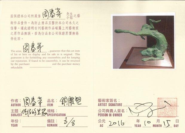 Article 18 Once the Buyer has successfully bid the auction lot, the Buyer may collect the lot once the aforementioned Purchase Price (include hammer price and buyer’s premium) is paid in full. Our Company reserves the right to ask for a thirty percent (30%) of the full Purchase Price as a deposit on the same day a er the auction and the remaining balance must be paid in full within ten (10) days a er the auction.