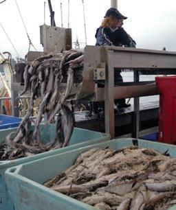 e translocation is done by Royal Greenland with the retro tted Tuneq well-boat that has a holding capacity of 120 tons divided over eight tanks. e well-boat comes installed with automatic graders and sorter systems to ensure only compliant cod are translocated. Undersized sh are released alive back into the ocean. Compliant cod are led into the well-boat and distributed over the eight tanks. is is an important step in the handling because it ensures that the water in each holding tank remains oxygenated at levels that mimic natural conditions to reduce the onset of stress or mortality.