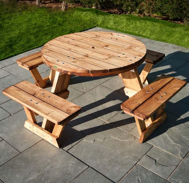 The wooden picnic tables are made from chunky fsc certified wood that has been immersed in spirit-based wood treatment rather than tanalised.