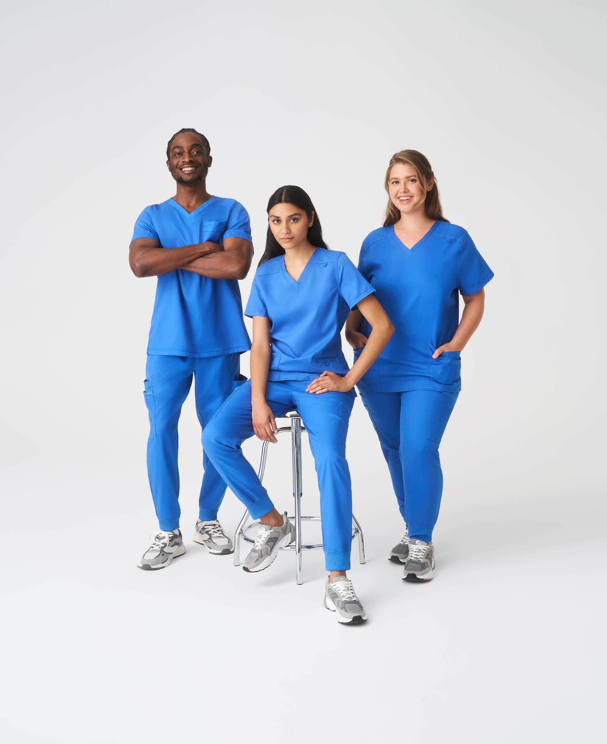 The premium scrub collection offers six activewear-inspired styles that include scrub tops and bottoms, zip jacket and a