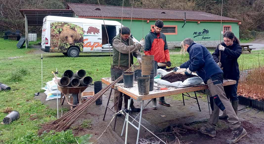 Fapas-Mitarbeiter Luis García und Monchu Magadan bereiten mit Studentinnen und Studenten Obstbäume für die Auspflanzung vor (Kampagne „Obstbäume für Gourmets“). Dadurch sollen Bären von Siedlungen in der Provinz León fern gehalten und Konflikte mit der Lokalbevölkerung vermieden werden.