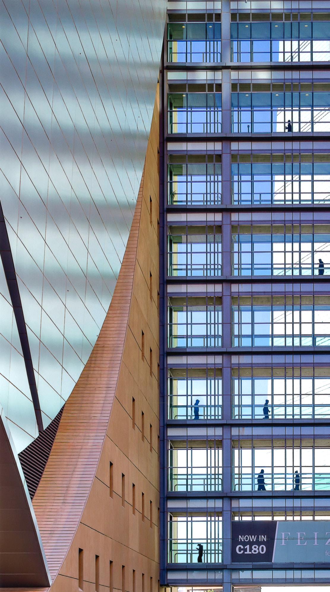 The cast-in-place trio of supports were designed to receive the entire length of the yard constructed bridge which had to be flown into place in a 45 minute span of time between train runs. Twin elevators coupled with an exterior helical stair serve the vertical transportation needs of the bridge, while opposing metal clad awnings that gently rise from the core, provide essential shading for pedestrian users. Custom graphic metal perforated panels were installed on each side of the walkway providing a windbreak as well as outwardly expressing the interior function.