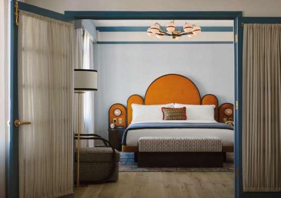 a ciudad de Los Ángeles siempre nos recordará a las celebridades más grandes del mundo, pero hospedarse allí y sentir que vives como una de ellas es una experiencia incomparable. Cuando Rosamond Borde soñó con abrir este hotel, su intención fue que la fachada turquesa art déco destacara sobre Ocean Avenue, con 84 habitaciones, la mayoría de ellas con vista al mar. Al entrar, el diseño te transporta a otra época, con elementos originales restaurados como techos altos, relieves decorativos y lámparas a medida. Te sientes literalmente dentro de una película de Wes Anderson, con colores suaves, simetría y ese encanto nostálgico. La magia perdura gracias a que los hoteleros Jon Blanchard y Nicolo Rusconi lideraron la transformación del edificio, respetando su esencia sin perder el espíritu original, logrando así capturar el glamour del pasado con las comodidades del presente.
