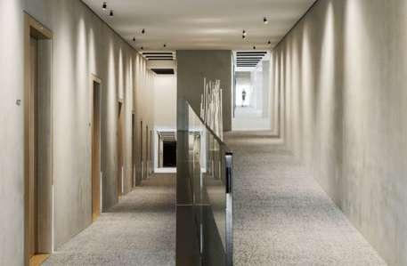 pasillos en zig-zag unen todas las habitaciones con su suave pendiente. En todas las áreas –desde el bar, los dos restaurantes, el spa, el gimnasio y los salones de juntas– el entorno es el protagonista. Los colores neutros dominan el espacio, acentuado con las formas sinuosas de elementos como las lámparas o las curvaturas de las sillas. La calidez y el confort conviven con un aire rústico que proviene de las praderas en las que las vacas pastan en absoluta calma.