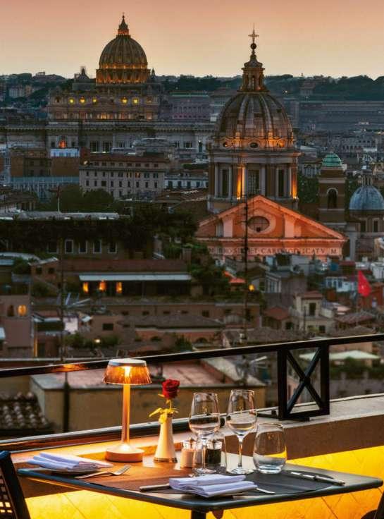 1. Las vistas de Roma desde el hotel Hassler. 2. La barra de Charlie's Rooftop Bar en el hotel InterContinental Roma Ambasciatori Palace. 3. Interior de Il Ristorante - Niko Romito en el Hotel Bulgari.