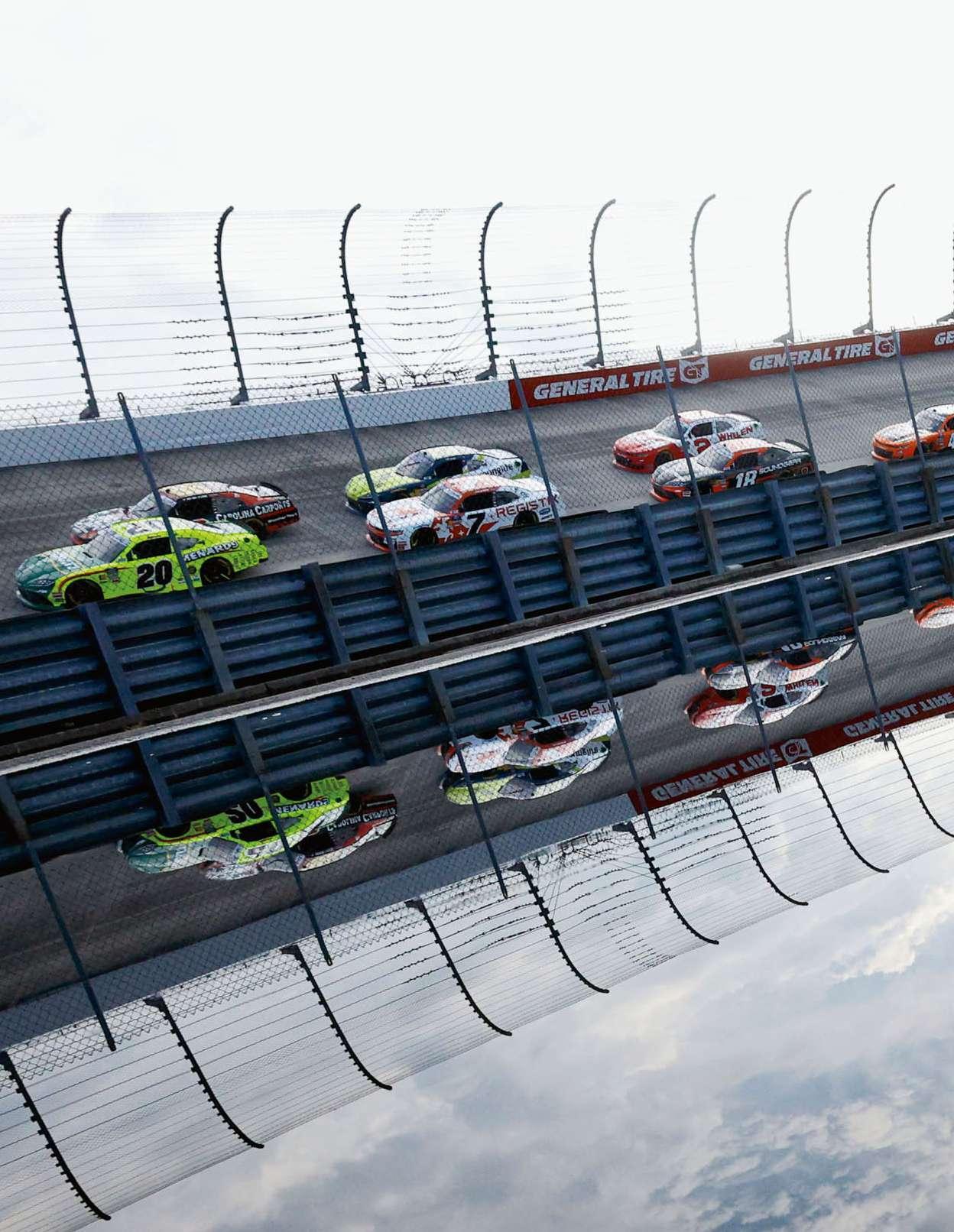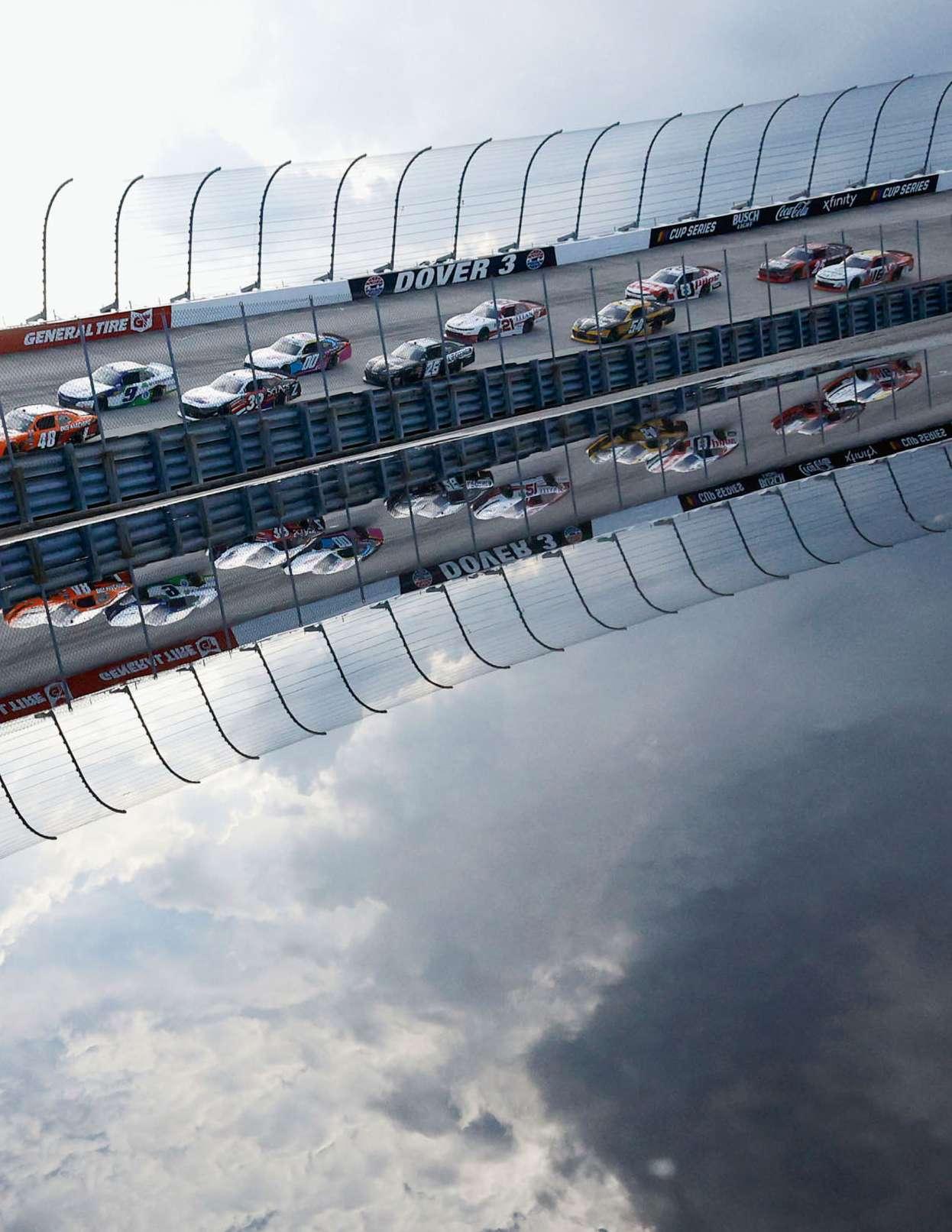 Al óvalo de NASCAR en Dover, Delaware, le llaman de “Monster Mile”. Sus curvas, con una inclinación de 24 grados, adhieren con fuerza los autos al pavimento y les permiten las más altas velocidades del circuito. Contrariamente, los reflejos imposibles que se generan en el suelo simulan un efecto de gravedad cero, la aspiración de todos aquellos que se dedican a la velocidad.