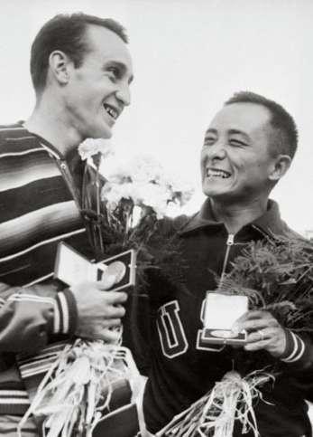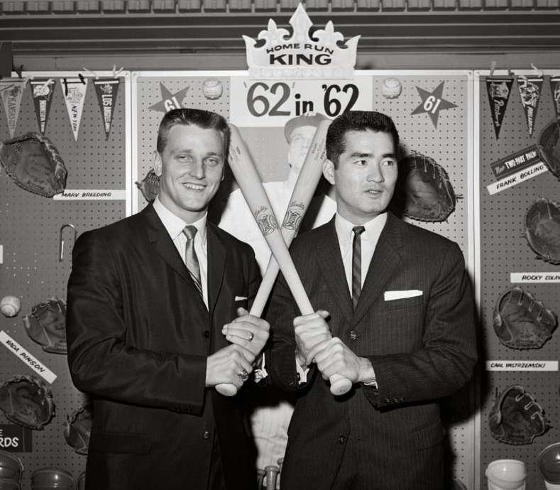 Roger Maris, y su récord de jonrones en Grandes Ligas, posa junto a Shigeo Nagashima.