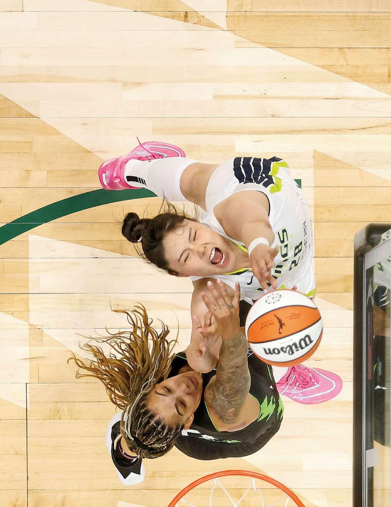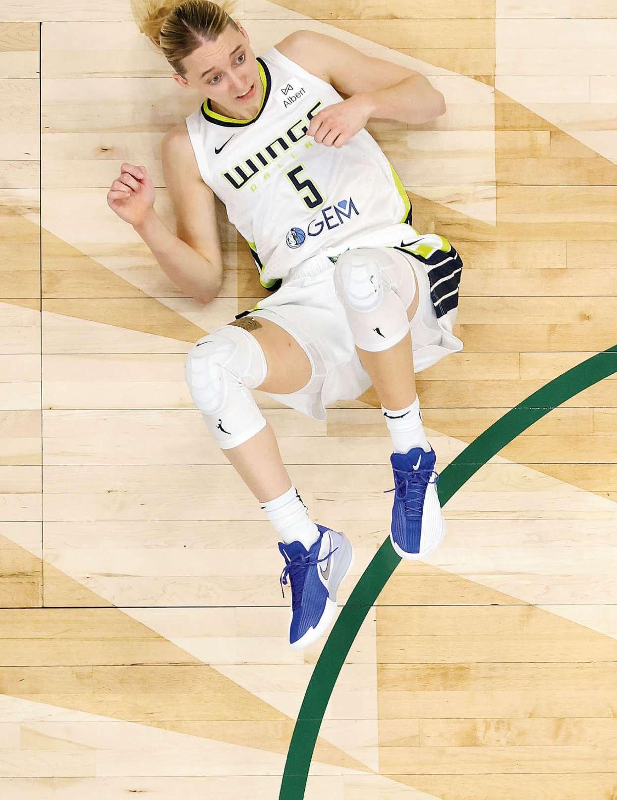 Con la espalda sobre la duela, Paige Bueckers, de las Dallas Wings, ve con gesto de desesperación cómo su compañera Li Yueru pelea el rebote en contra de Gabby Williams, del Seattle Storm.