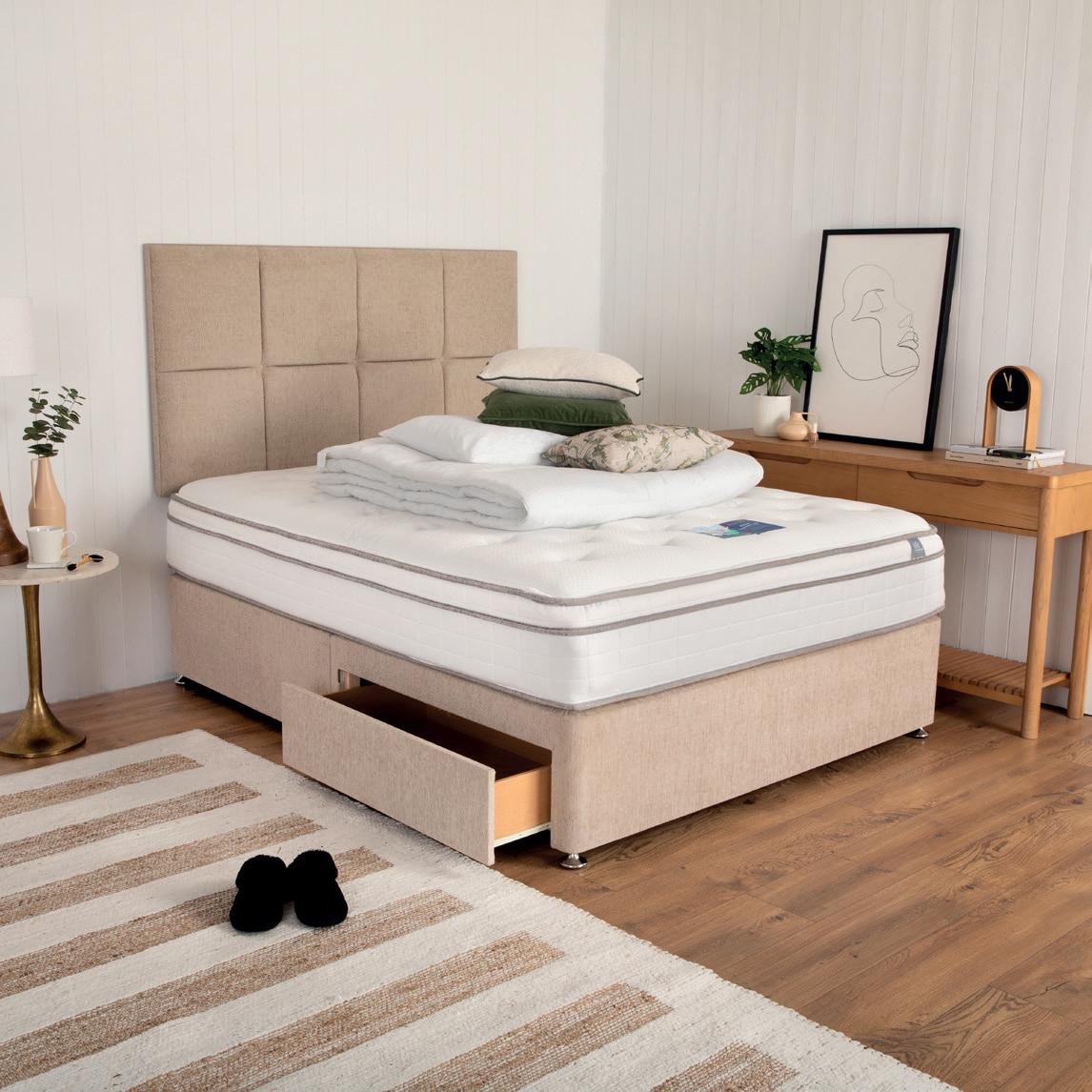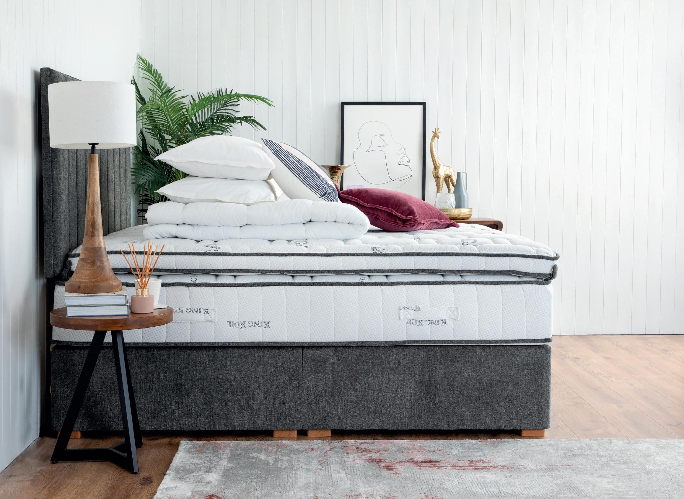 1. King Koil Extended Life Superb Pocket Sprung Mattress 3’ €799, €1099, 5’ €1249, 6’ €1499 | King Koil Extended Life Divan Kirsty Fabric 3’ €359, 4’/4’6” €499, 5’ €549, 6’ €649 Waterford S-Height Headboard 3’ €219, 4’/4’6” €299, 5’ €329, 6’ €399 2. King Koil Comfort Supreme Pillowtop Mattress 3’ €799, 4’/4’6” €1099, 5’ €1249, 6’ €1499 | King Koil Ottoman Divan Kirsty Fabric 3’ €799, 4’/4’6” €1029, 5’ €1129, 6’ €1449 | King Koil Lee S-Height Headboard 3’ €219, 4’/4’6” €299, 5’ €329, 6’ €399 3. King Koil Extended Life 1200 Support Mattress 3’ €749, 4’/4’6” €999, 5’ €1099, 6’ €1399 | King Koil Extended Life Divan Kirsty Fabric 3’ €359, 4’/4’6” €499, 5’ €549, 6’ €649 Shannon S-Height Headboard Kirsty Fabric 3’ €219, 4’/4’6” €299, 5’ €329, 6’ €399 4. King Koil Pocket Supreme 1200 Mattress 3’ €599, 4’/4’6” €799, 5’ €899, 6’ €1099 | King Koil Kirsty Divan 2 Drawers 3’ €399, 4’/4’6” €549, 5’ €599, 6’ €699 | Liffey S-Height Headboard Kirsty Fabric 3’ €219, 4’/4’6” €299, 5’ €329, 6’ €399 *Warranty: 10 Year Warranty when mattress bought on its own. 15 Year Warranty when Purchased with Extended Life Divan 5 Year Warranty 1200 Springs Extra Firm Micro Quilted 10* 3 Year Warranty 1500 Springs Medium Firm Pillowtop 10* 4 Year Warranty 1400 Springs Firm Reversible Pillowtop 10* 4 4 Year Warranty 1200 Springs Firm Micro Quilted 10* 2 1 3