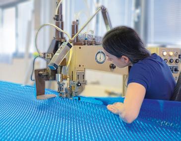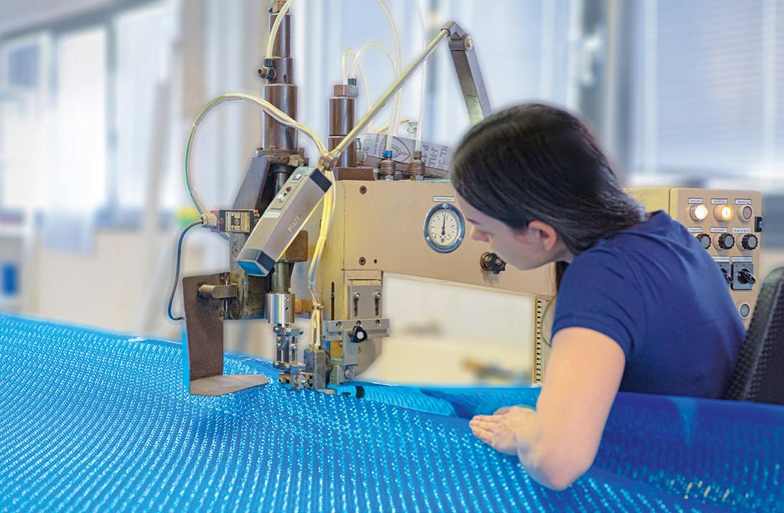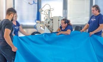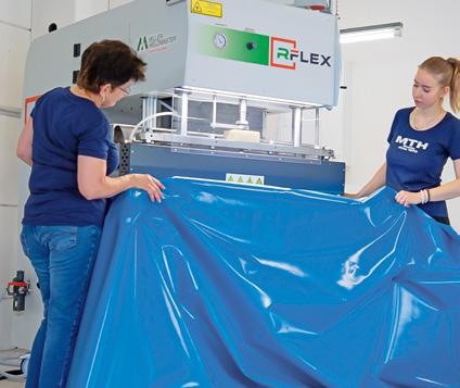 wird das Material maßgenau zugeschnitten und mittels Heizkeil- sowie Hochfrequenztechnologie verschweißt. Zunächst entsteht der Boden, anschließend wird er mit der Folienwand vereint – die sogenannte „Hochzeit“. In weiteren Zwischenschritten werden u.a. passgenaue Biesen zum Einhängen der Innenhülle angebracht. Das Ergebnis: hohe Maßgenauigkeit und lange Lebensdauer.