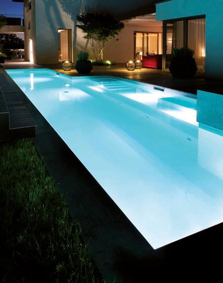 Auch Licht spielt eine große Rolle: Integrierte LED-Streifen sorgen für stimmungsvolle Beleuchtung und setzen neue Standards im Bereich funktionaler Poolgestaltung.