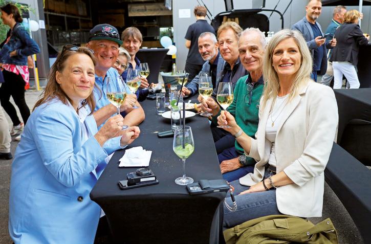 Ute Wanschura vom bsw (vorn links), Sonja Stalder (vorn rechts) mit ihrem Team der Vivell AG, dahinter Peter und Manuel Hütel von Hütel & Meß in fröhlicher Runde.