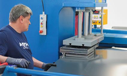 lich mit Polyesterschutzlack versehen. Im Premiumsegment kommen Aluminiumvarianten zum Einsatz. Die Coils werden zunächst passgenau abgelängt, anschließend sorgfältig umgebördelt. Typisch für MTH: Die Skimmer- und Düsenausschnitte werden vorgestanzt, nicht durchgestanzt – ein Fertigungsschritt, der mit modernsten Stanzmaschinen erfolgt.