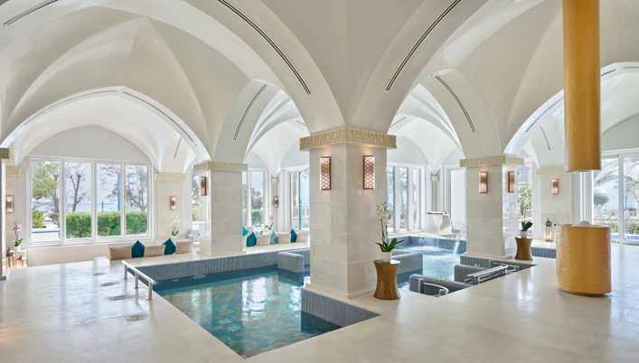 On entering, you’re immediately struck by the magnitude of the resort, and the spa (though tucked into one section) retains every bit of that grandeur: tall ceilings, ivory marble-clad panels, unique custombuilt water features and breathtaking panoramic views of the Arabian Gulf make the experience nothing short of extraordinary. Mirroring the Arabian heritage of the resort, the spa's entrance is adorned with a white and brilliantly bright blue exterior, the vibrant hues evoking both coastal serenity and cultural richness. Throughout every crevice, the spa exudes a serene elegance, illuminated by the soft glow of dimly lit candles and lanterns. A striking chandelier hangs overhead, casting a warm, golden light that dances across the intricately engraved pillars and ceilings.