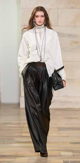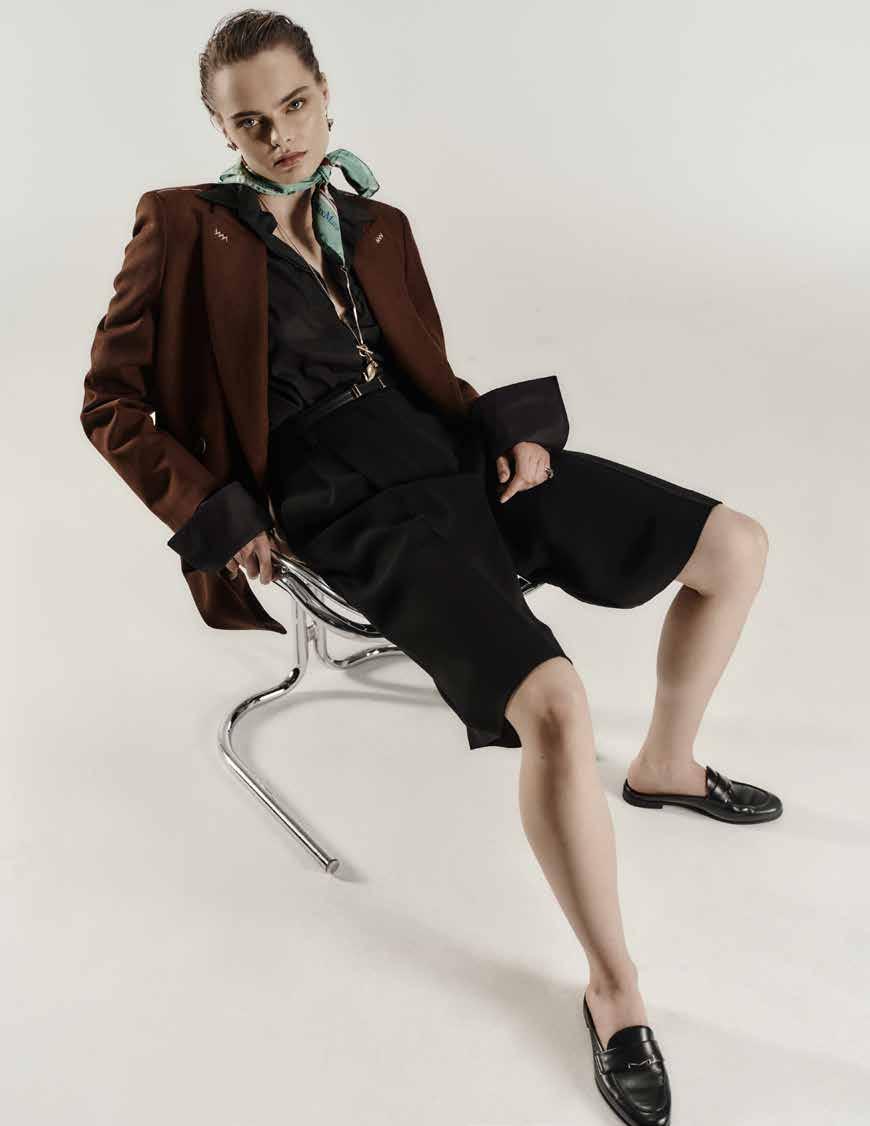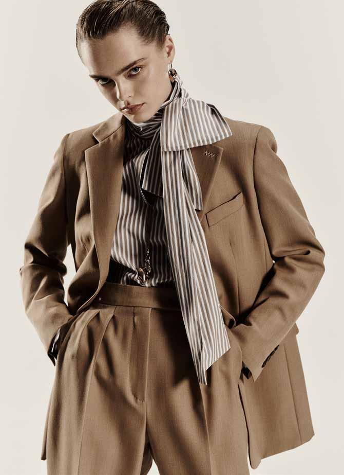 When Max Mara launched its Tailored Suit project 11 years ago, it introduced a collection of classic, high-quality suits for women, inspired by traditional men’s tailoring techniques. The jacket was an overlooked element, seen as secondary to other style solutions. But the brand sees this piece as a travel companion and an instrument of self-affirmation. The goal of this project was to translate an icon of menswear into a jacket whose cut, proportions and finish easily adapt to feminine curves. It is a laborious job; it takes 345 minutes of work to make a Tailored Suit jacket, twice that of a standard style. The refined fabrics, the canvas on the inside, the 130 hand-sewn stitches on the armhole and the careful pressing make it unique in the natural way it moulds to the various female physiques. For Autumn and Winter 2025, the jacket comes in double- and single-breasted versions. The silhouettes play with constructed/deconstructed contrasts, where more formal double-breasted and semi- or fully-lined versions alternate with a softer, canvassed structure that resemble a lightweight shirt. Then there is the double-breasted jacket with elongated lapels and the velvet tuxedo version. On the single-breasted front, the ultra-feminine, three-button jacket is back with an accentuated waist. There is also a lightweight, two-button version in flowing fabric, as well as a menswearinspired version with longer proportions. The materials range from light, pure-cashmere melange to smooth velvet and ultra-light pure wools, plus the must-have pure-camel drap, the new slubbed melange wool, the Shetland effect that blends refined materials such as alpaca, cashmere, camel hair and yak, and finally, the yarn-dyed pinstriped and checked patterns. As for the colours, traditional shades such as ivory, black, kasha (golden brown), camel, grey and navy blue are accompanied by nude, denim blue that fades into light blue, loden green, brown and gold. A capsule made for women who travel, work, speak up, explore, listen and invent –mothers, sisters and daughters.