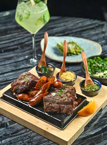 a clever mix of crunch and cream, elevated by a rich black truffle aioli that lingered with every bite. To sip alongside, I tried the alcohol-free Elderflower and Passion Fruit Martini, floral, tangy and far too easy to order another round of. For something more unique, the Azure mocktail was a standout. The coconut cream, lychee and lime with soda, served in a vivid blue drink made it feel just as tropical as it tasted. The small plates set the pace nicely. The Wagyu Gyoza arrived first, delicate little parcels of pan-fried goodness topped with a sweet soy drizzle. The melt-in-your-mouth Wagyu filling, brightened by ginger, paired beautifully with the sweet kabocha (Japanese squash) purée. The Shrimp Tempura, though, stole my heart. Golden, battered shrimps on a bed of greens, tossed in spicy mayo and black truffle vinaigrette. Crunchy, creamy and so addictive I could’ve polished off the whole bowl alone. To try something raw, we sampled the Tuna Seviche (ceviche with ‘s’ from SUSHISAMBA) –cubes of fresh tuna swimming in a citrusy leche de tigre. The acidity was sharp but balanced, with pomegranate seeds adding bursts of sweetness and wasabi peas lending a much-needed crunch. For the mains, we made sure to cover all three cuisines. From Brazil came the Churrasco Rio Grande, one that I had been eyeing all night. A sizzling hot plate of ribeye, chorizo and picanha (a speciality Brazilian cut), served with chimichurri, black beans, collard greens and farofa (toasted cassava flour). Each cut was distinct: the ribeye juicy with just the right fat-to-meat ratio, the picanha tender with its signature cap of fat, and the chorizo boldly smoky and spicy. It only got better with each bite, the accompaniments adding new twists that kept things exciting till the very end.