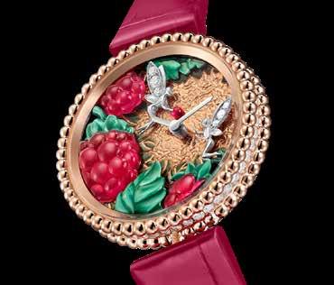 Central to these watches are the sun-kissed berries, with their curves being brought to life through façonné enamel. This technique, devised and patented by Van Cleef & Arpels in 2023, enables enamel to assume rounded, three-dimensional forms. Powder is poured into a mould, fired twice under carefully controlled temperatures, then polished, carved and glazed to achieve a luminous surface. The effect is striking: a play of volume and transparency that captures the richness of ripe fruit.