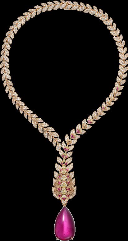 This necklace showcases an element that is completely hidden yet obvious. A turtle is concealed within an abstract necklace, featuring an imposing 71.90-carat rubellite. At first, the eye cannot grasp the outline, but once you see the turtle, you can’t unsee it. You have to look closely to notice the roundness and volume of its shell and the detail of its scales. The game of camouflage is revealed alongside its versatility: the animal appears in its entirety, head and legs included, when detached to become a brooch.