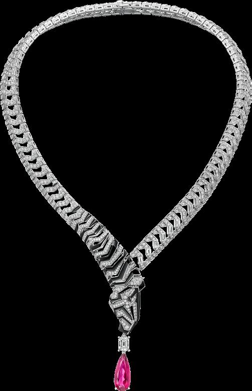 Two becomes one. Sinuous and symmetrical, two snakes around the neck, side by side, compose this bold piece. With diamond scales set with emeralds and heads crowned with kite diamonds, they embrace the neck with glamour. Between them are nine octagonal emeralds from Colombia totalling 14.72 carats. A hybrid composition in which the organic blends with the urban through an interplay of perfectly geometric, highly vertical motifs.