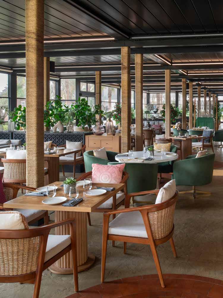 If you’ve never been to The St. Regis Marsa Arabia Island, then accompany me. A wide, welcoming driveway climbs up to a stately courtyard perfectly designed for a smooth drop-off at the hotel’s grand entrance. Once inside, a showstopper chandelier fills our vision – a flock of aquamarine glass birds encircles a shower of dazzling crystals, with the finishing touch provided by a host of golden flowers. Frankly, it’s worth coming here just to see the chandelier. Next, we pass a bold artwork before descending to the ground floor, where the hotel meets the bay. We see palm trees sway between wooden cabanas, an enticing shoreline and softly lapping waves. Overlooking it all, we spot the restaurant. It couldn’t have a better view. We’re here for an à la carte dinner that we know is going to tick absolutely all the boxes and step inside, ready to be wowed. An industrial steel framework is softened by the boho chic of the décor, with velvet armchairs, soft cushions, low lighting, greenery and warm shades of burnt umber, taupe and mustard everywhere. Meanwhile, panes of glittering glass guarantee that the restaurant is light and airy and when the weather is warm enough, the roof opens to bring outside in.