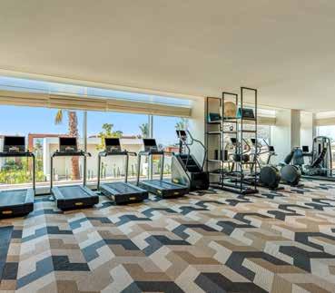 Stepping into the indoor gym, I was struck by the abundance of highend equipment neatly arranged across a bright and airy space. The layout was as practical as it was inviting, with rows of treadmills offering views of the palm-fringed outdoors and strength-training machines strategically positioned to allow smooth navigation. Natural light pouring through large windows created an energising atmosphere, while the bold geometric flooring added a stylish touch.