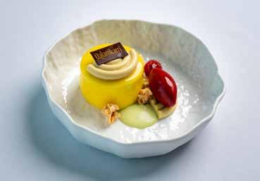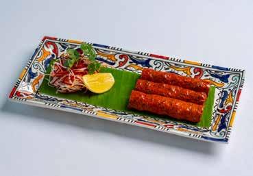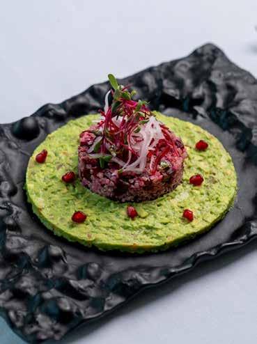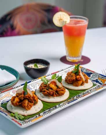 Among the hot starters, the black pepper chicken is simple and tender, with just enough peppery heat to linger. The paneer tikka is marinated in red masala spices and fired in the tandoor, holding its shape before crumbling into creamy deliciousness. A Kashmiri seekh kebab, made with finely minced and spiced lamb, is soft and aromatic with subtle sweet-sour notes. Mains arrive in a flourish of colour and scent, offering a tabletop tour of the nation. The butter chicken, from North India, is a deep umber, its surface swirled with cream like contour lines on a map – the flavour rich with tomato and smoky spice. A South Indian seafood curry offers contrast: prawns, scallops and delicately flaky sea bass are barbecued and then bathed in a toasted and fragrant coconut-based curry. We scoop it up greedily with simple roti flatbread and a contemporary fusion twist on naan with local za’atar herbs – it is a beautifully flaky and layered bake and, unexpectedly, one of the meal’s highlights. Then, the showstopper: whole lamb shank biryani sealed beneath a golden dome of bread, baked in a clay pot. The lid is cracked open at the table, releasing a fragrant rush of steam and the treasures beneath of saffronstained rice studded with cashews, raisins and fried onions. The lamb is rich, falling from the bone and the dish feels gloriously celebratory – a real centrepiece.