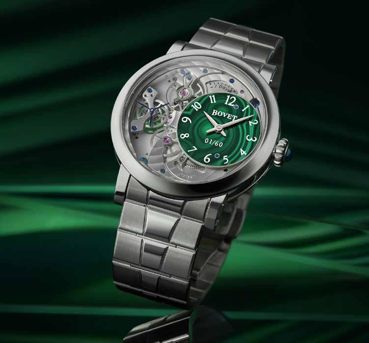 Malachite dials are celebrated for their mesmerising green hues and intricate, naturally occurring patterns, which range from wavy bands to concentric circles, making each dial a work of art. The green also echoes the forest-covered Jura Mountains around the BOVET castle, a strong source of inspiration.