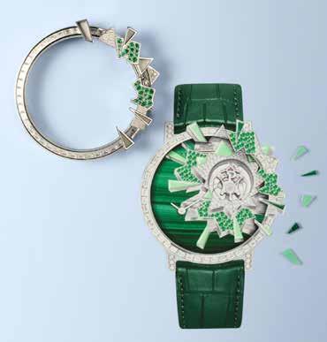 Top designs include the Kaleidoscope Lights suite, where ornamental stones such as rhodochrosite, sugilite and verdite are carved into linear mosaics. The effect recalls the colourful energy of Op Art, achieved through meticulous lapidary work. In contrast, Flowing Curves embraces organic irregularity, featuring black opals set in hand-hammered white gold. This suite pays homage to Yves Piaget’s fascination with opals, a gemstone he once described as encapsulating ‘different tastes and sensibilities’. Other themes introduce colourful gemstones for expressive colour stories: spinels in the Wave Illusion suite express the playful geometry of the Memphis movement; yellow sapphires illuminate the Curved Artistry suite, where a secret ring watch hides beneath an aquamarine cabochon; and emeralds take centre stage in both the Gleaming Shapes and Arty Pop suites. Piaget’s dual mastery of jewellery and watchmaking is also evident. Many sets include watches with ultra-thin movements where their dials are integrated into bracelets. The Joyful Twirls cuff watches, with their gem-set swirls in blues and reds, demonstrate how horology can be both technically sound and visually theatrical. The collection rounds off with Endless Motion, a table clock created in collaboration with French artist Alex Palenski. Designed as a mobile sculpture, the piece features quivering branches set with ornamental stones, symbolising Piaget’s rebellious spirit and creative force.