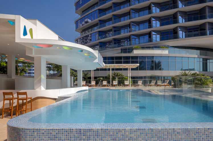 My one-bedroom apartment was huge, nearly 100sq/m, airy, modern and bathed in natural light from floor-to-ceiling windows framing Dubai Creek and, in the distance, the spire of the Burj Khalifa. The pink theme continued in subtle accents, tying the interiors together. A fully equipped kitchen, complete with a stove, oven and a lifesaving coffee machine, sat ready for longer stays. Even laundry was considered, with a washing machine and detergent pods available on request. The living area held a dining table, TV and a welcome spread from the hotel’s Hi-Bye Café: delicate pastries, glossy bonbons and a tray of exotic fruits that were thoughtful touches setting the tone for my stay. Inside the bedroom, the king-size bed was just the right blend of cloud-soft and supportive, with pillows that hit that elusive perfect fluff level and a TV to watch to extend my bedtime. My favourite feature, though, was the powder room. It connected both bedroom and living room with jack-andjill doors and housed a deep soaking tub, a rainforest-style shower with built-in speakers and every amenity I could possibly need. Not once did I have to call for an extra.