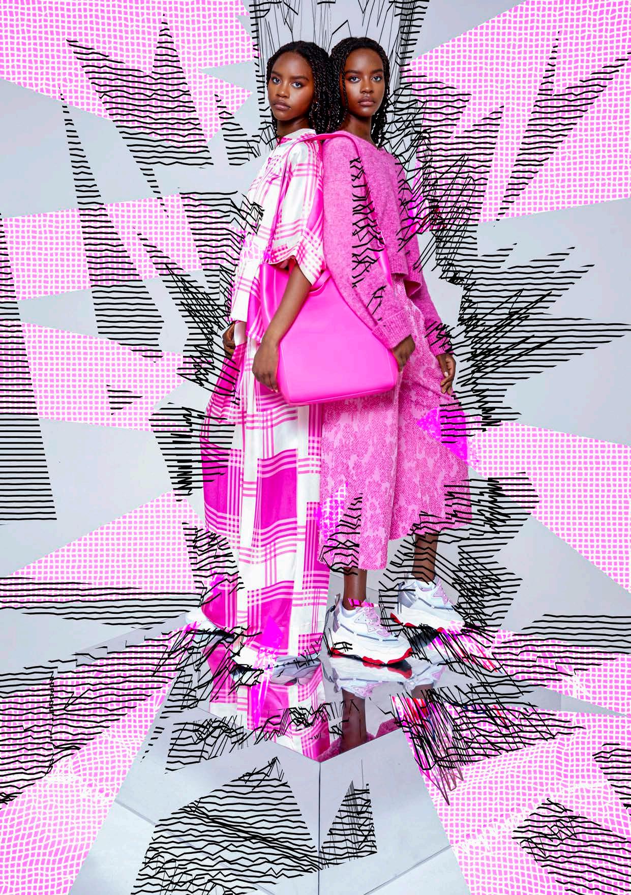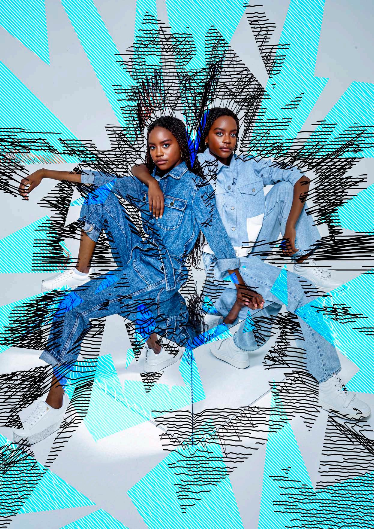Charleen & Charmaine. Jacket by Stine Goya£425.00, From Manna. Boots by ALDO - £150.00. From Voisins Dress by Stine Goya - £395.00, From Manna. Boots by ALDO£120.00.From Voisins