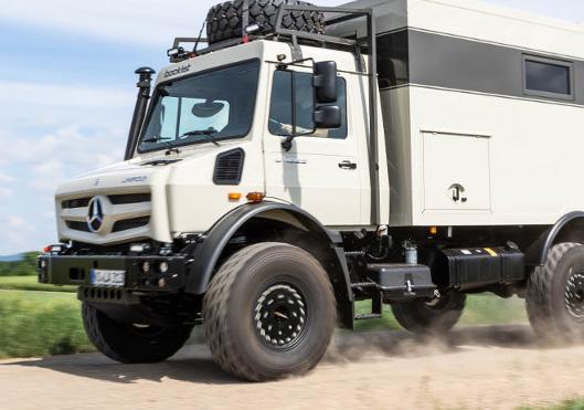 Weighing in at eighteen - yes, eighteen - tonnes and with a 5.8m by 2.4m main living area, if the Unimog above is equivalent to a small flat, this off-road motorhome based on an all-wheel-drive Arocs 4x4 chassis is more akin to a penthouse apartment owing to both its spacious interior and impressive height. Much like many a soughtafter apartment it also comes with parking in the form of a garage that’ll happily accommodate a motorbike inside the vehicle for added security plus an additional storage compartment for two bicycles.