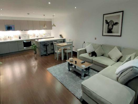 for cooking, dining and relaxing. Features include recessed lighting, wood effect flooring and picture windows to front. The fully fitted kitchen includes integrated appliances including hob, extractor, oven, microwave, fridge, freezer and dishwasher. Centre island and breakfast bar. The apartment has two double bedrooms with fitted wardrobes and large windows. Tiled flooring and recessed lighting. The bathroom has a four piece suite comprising shower, bath, basin and WC. Fully tiled walls and floor.