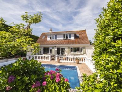 This elegant detached family home is situated in an elevated position enjoying high levels of natural light and far reaching views over St Helier harbour and Greve d’Azette to the coast. The superb open-plan kitchen/ dining area has sliding doors to the living area making for a flexible space for entertaining. Glazed doors open to the garden and a large south facing