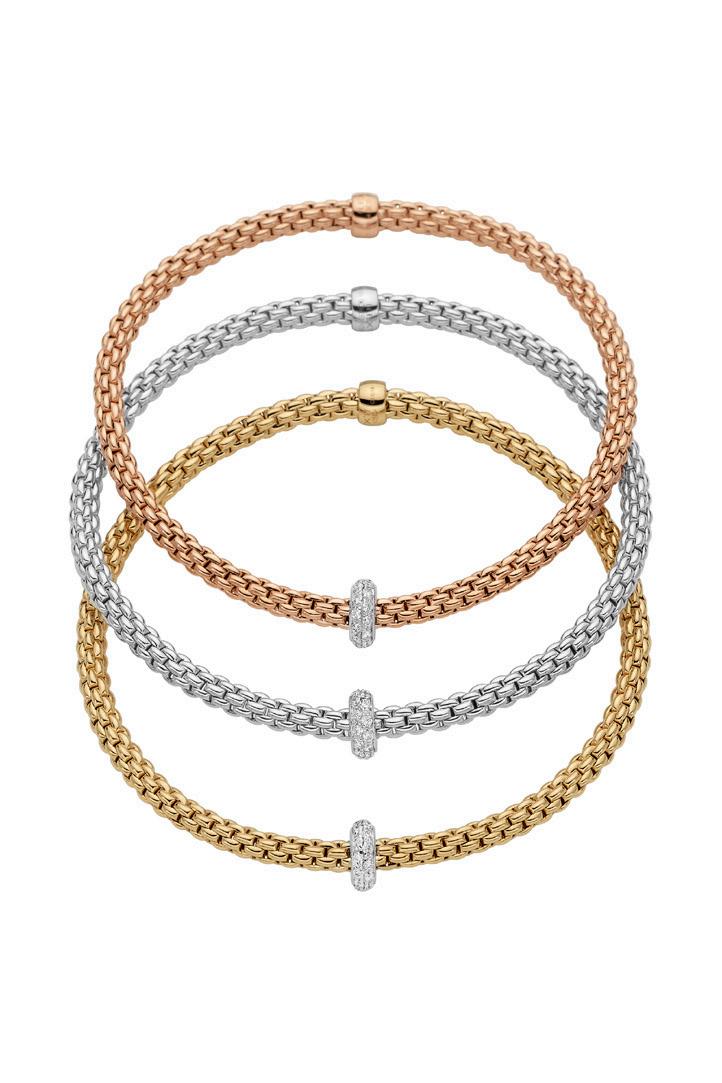 Prima, the slimmest addition to the Flex’it family, asserts a fine, sophisticated style. Expertly crafted mesh chains conceal dozens of miniscule 18 carat gold springs, making these bracelets as smooth as they are flexible. Can be worn individually or layered with other FOPE creations.