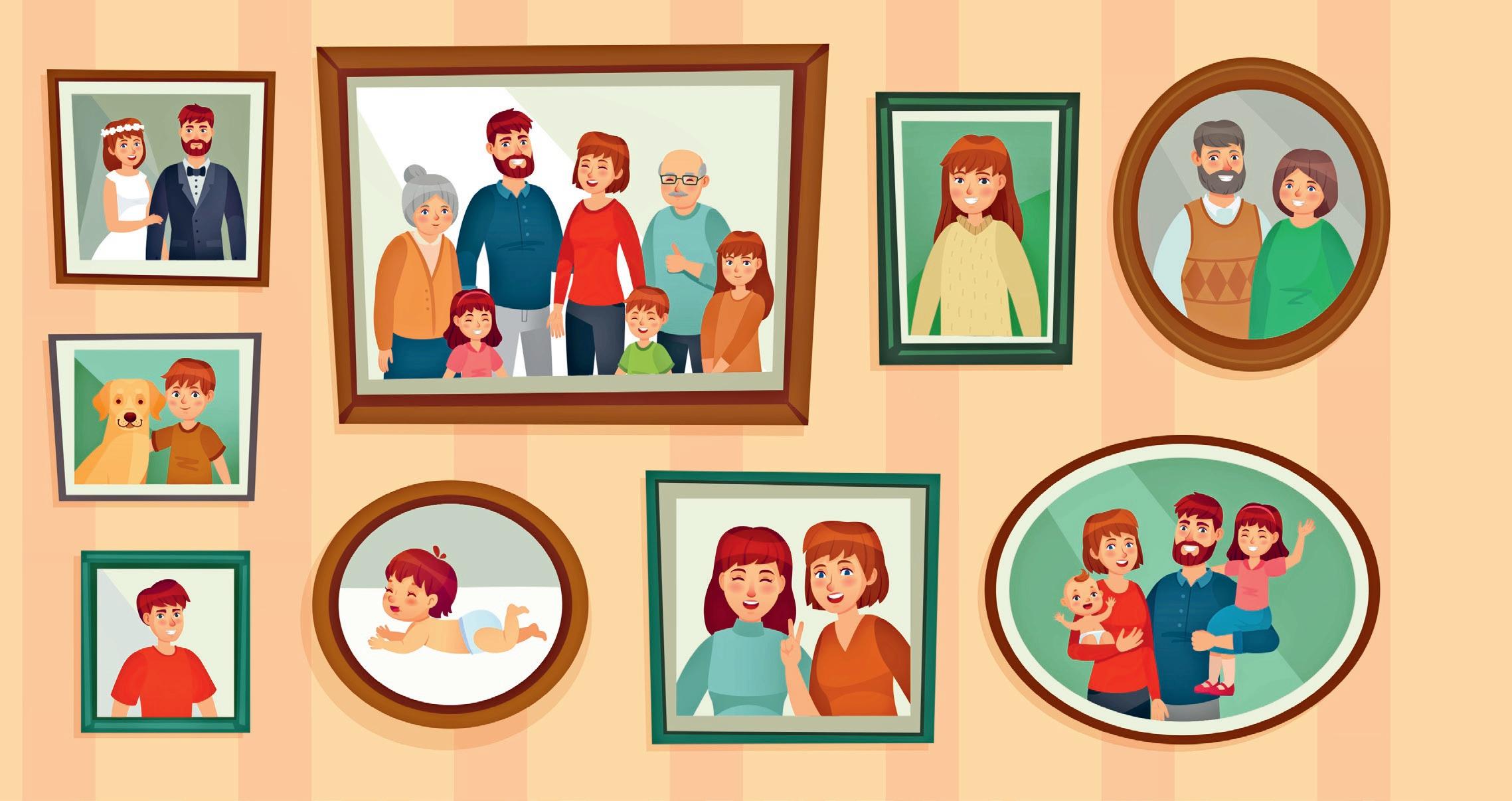 Sjå på bilda på veggen og snakk om familien: Kven er dei? Kor gamle er dei (no)?