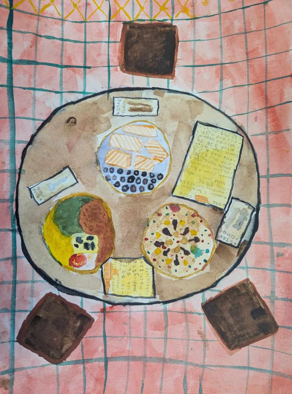 My artwork is about all the different dishes from the people that live in Fairfield. I included dishes like Sushi, Pho, Chinese, Lebanese/Assyrian, pizza, Indian and my favourite festival/food truck food.