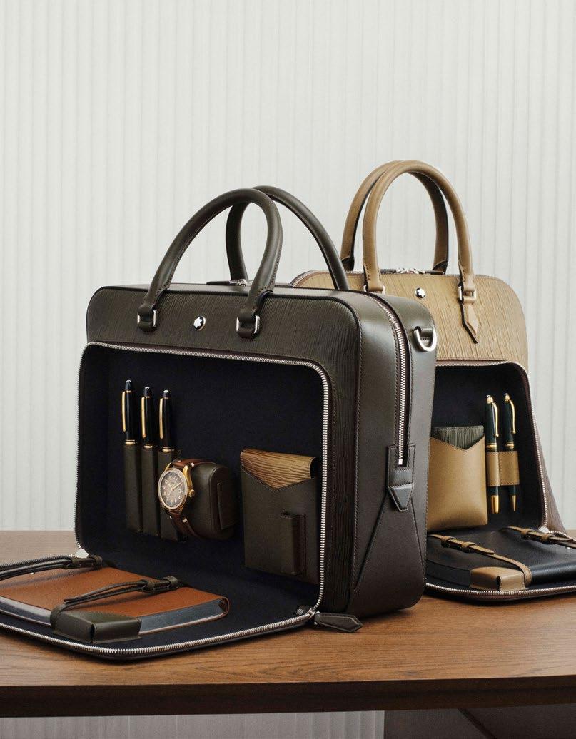 werden. Das gesamte Set – limitiert auf 1'969 Stück – kommt nämlich in einem grünen Blechetui mit korallenrotem Futter daher und erinnert an eine Werkzeugkiste. Die skurrilen Figuren in Andersons Filmen sind oft auf Achse – mit alten Flugzeugen, Zügen oder Fahrrädern. Dazu passt die Writing Traveler Tasche aus der Herbst-Winter-Kollektion von Montblanc. Mit reichlich Fächern für Notizbücher und Schreibgeräte und einem Uhrenfach bringt die Ledertasche einen wunderbaren Touch Nostalgie in unsere digitale Welt. Wer weiß, vielleicht kommt einem so auf der nächsten Reise die zündende Idee für das eigene Filmprojekt – dem Niederschreiben steht nichts mehr im Weg. montblanc.com