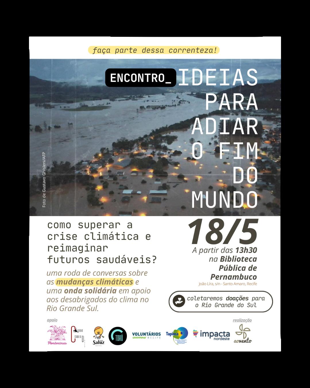 O encontro "Ideias para Adiar o Fim do Mundo" inspira-se na obra de Ailton Krenak e busca resgatar nossa capacidade de olhar, sentir com o coração e inspirar futuros saudáveis. É preciso olhar para trás sem soberba, encarar o presente sem medo e plantar o futuro “com presença de alma”. Este encontro é uma roda de conversa para discutir as mudanças climáticas, inspirar soluções e, sim, mudar o que está posto.
