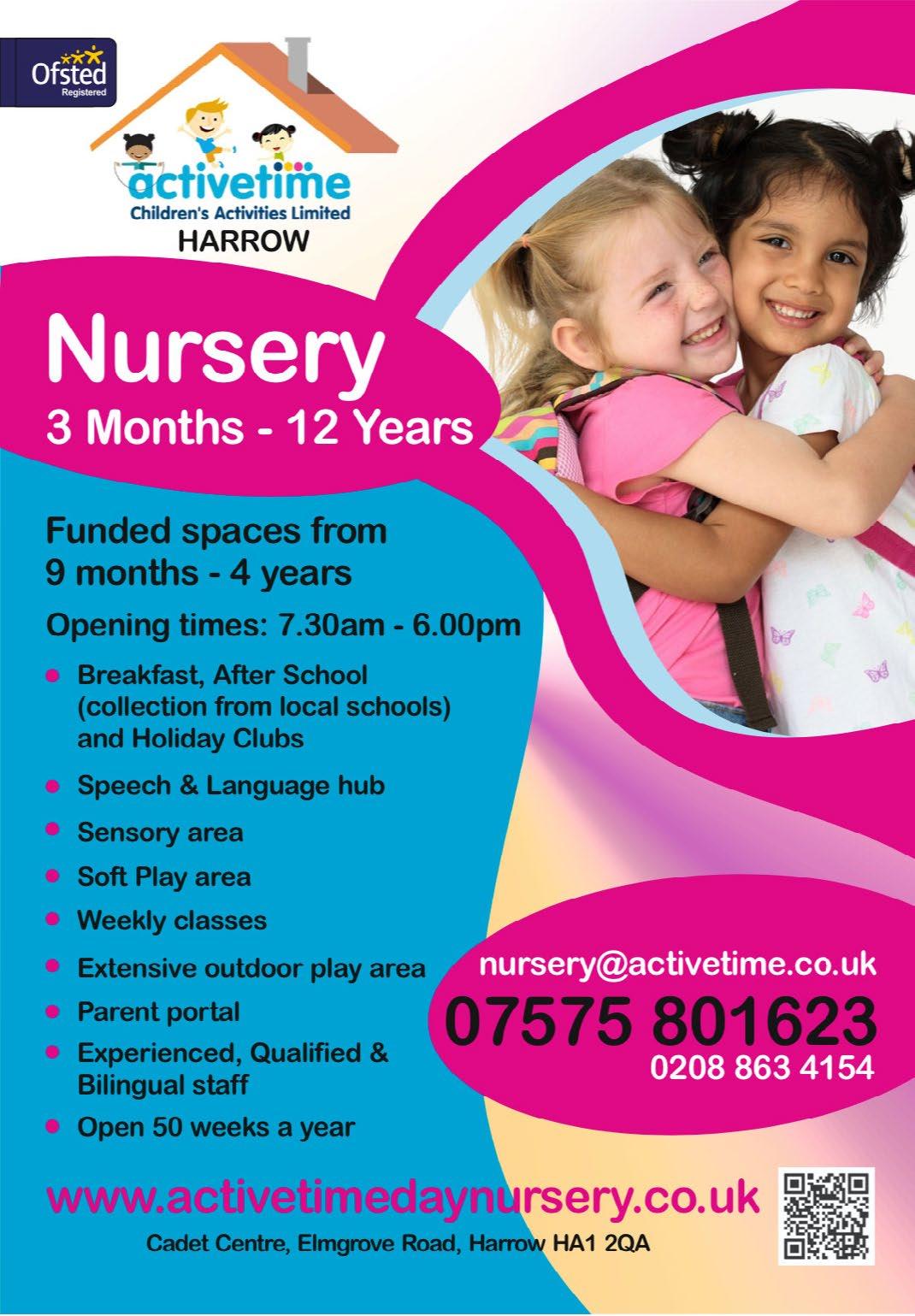 Pick up from four local schools at the end of the school day, then take the children back to the club for a snack and the daily activity. Open Mon-Fri 3-6pm at The Cadet Centre, Harrow, HA1 2QA. Call 07575801623, email holidays@ activetime.co.uk www.activetimedaynursery.co.uk