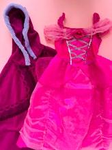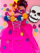 This began with a pink princess dress and a Frozen cape, which I covered in faux flowers I had stashed at home and some little wooden skulls that I had bought a few years ago from Hobbycraft for Halloween. I then found a headband covered in flowers (from the days when I used to go to fancy dress parties) and added some little skull beads to it that I found on Amazon. The only equipment required for this transformation was a glue gun.