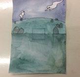 Step 6: Draw and outline ghosts and tombstones on to the A4 piece of card. Find some ghosts on the internet to inspire your child. Then paint.