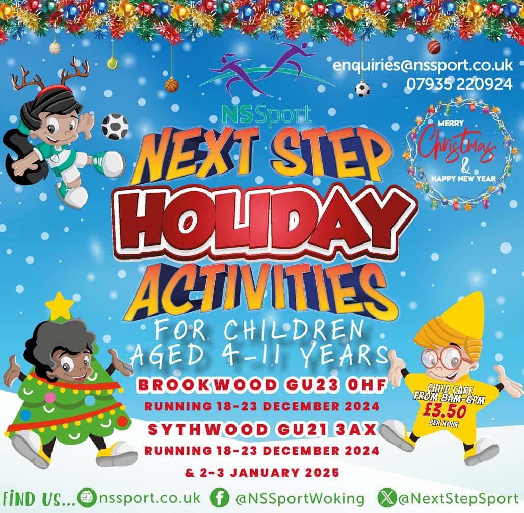 NSSport Holiday Activities is the perfect place for your children to have fun! They provide active, affordable, and exciting childcare during the holidays for children aged 4-11. Their two programmes, NS Stars and NS Strikers, will see your child enjoy their time away from school. Their unique programmes, led by a dedicated, enthusiastic, and highly qualified team, ensure your child can maintain their development and learning through play in a safe and appropriate environment. They run at Brookwood Primary (GU24 0HF) and Sythwood Primary (GU21 3AX) from 8am-6pm over the Christmas holidays. Book at nssport.co.uk or email enquiries@nssport.co.uk.