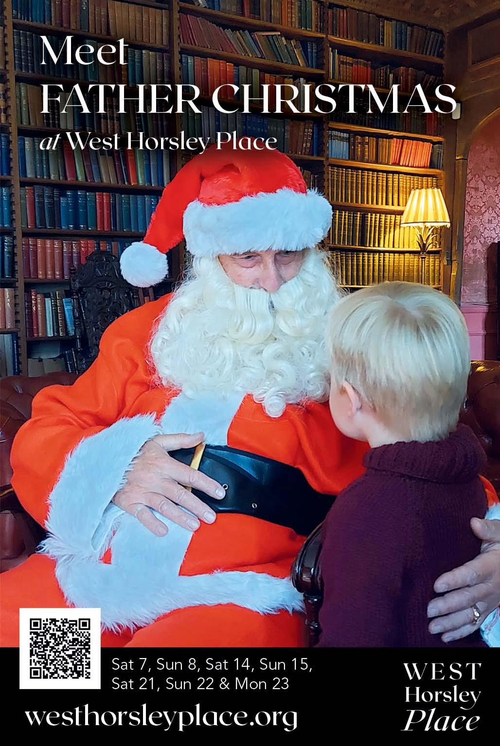 In the ancient and beautifully decorated Manor House at West Horsley Place enter the world of Father Christmas and his elves. Your festive experience will of course include meeting the big man himself, but so much more besides! The charming building will be full of activities to celebrate the season, including toys, games, a craft room and biscuit decorating in the Tudor kitchen. Available on Sat 7, Sun 8, Sat 14, Sun 15, Sat 21, Sun 22, Mon 23 10am – 4pm. Adult £5, children £12. Book in advance at: www.westhorsleyplace. org/Event/meet-father-christmas-at-westhorlsey-place or scan the QR code.