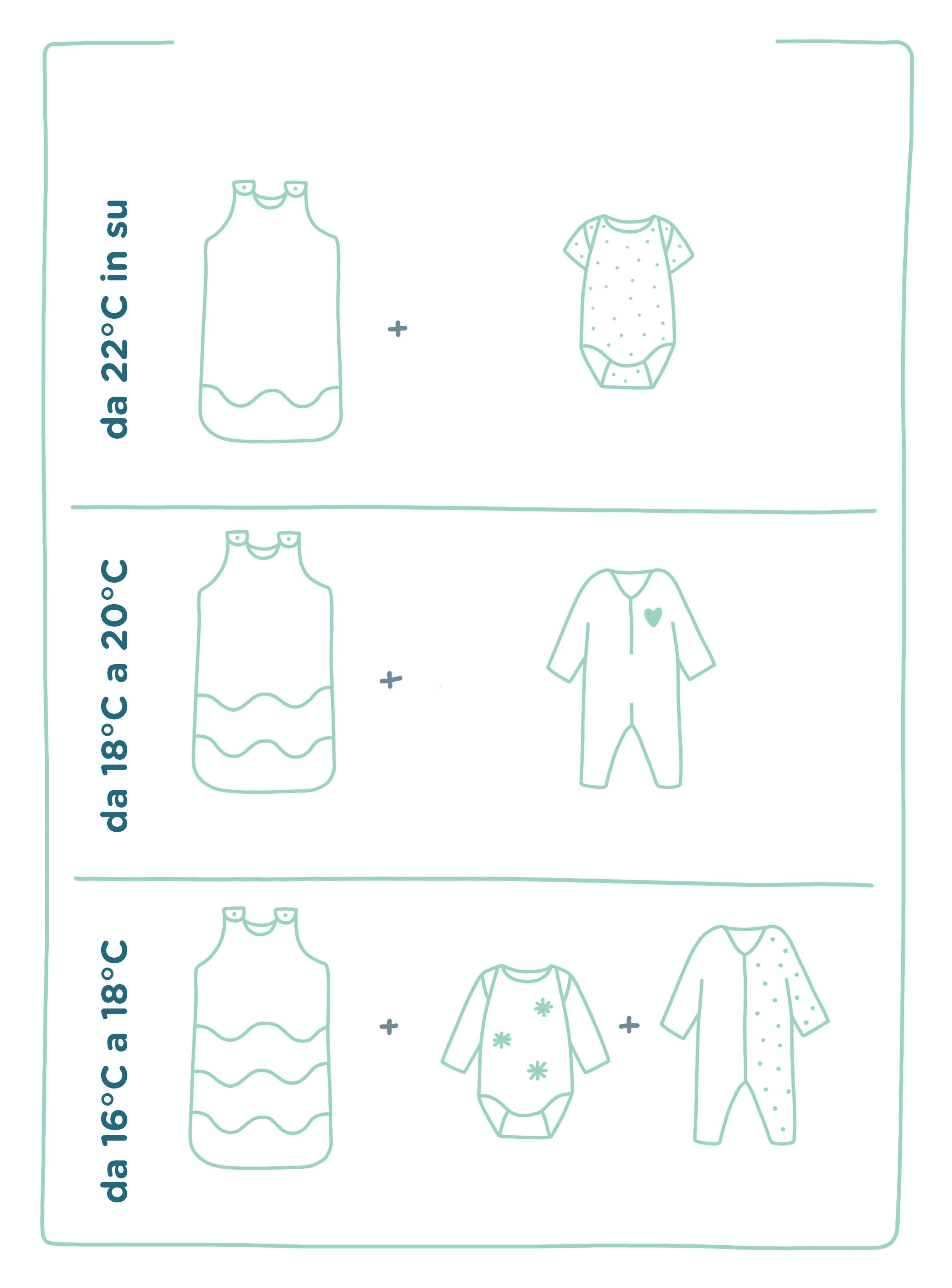 La temperatura è un tema decisamente più oggettivo: quella ideale per la stanza sta tra i 18 e i 20 gradi con 40%-60% di umidità. Il bambino va vestito in base ai gradi della camera. Quando il bambino è molto piccolo è bene evitare coperte e piumoni; una buona soluzione è il sacco nanna, che garantisce il contenimento, il calore e la sicurezza (perché non c’è possibilità di soffocamento). Dall’autunno alla primavera è ottimo un sacco nanna da tog 2.5, cambiando l’abbigliamento del bambino in base alla temperatura esterna. Il sacco nanna ha un bottoncino sulla manica in modo da evitare che il bambino ci scivoli dentro.