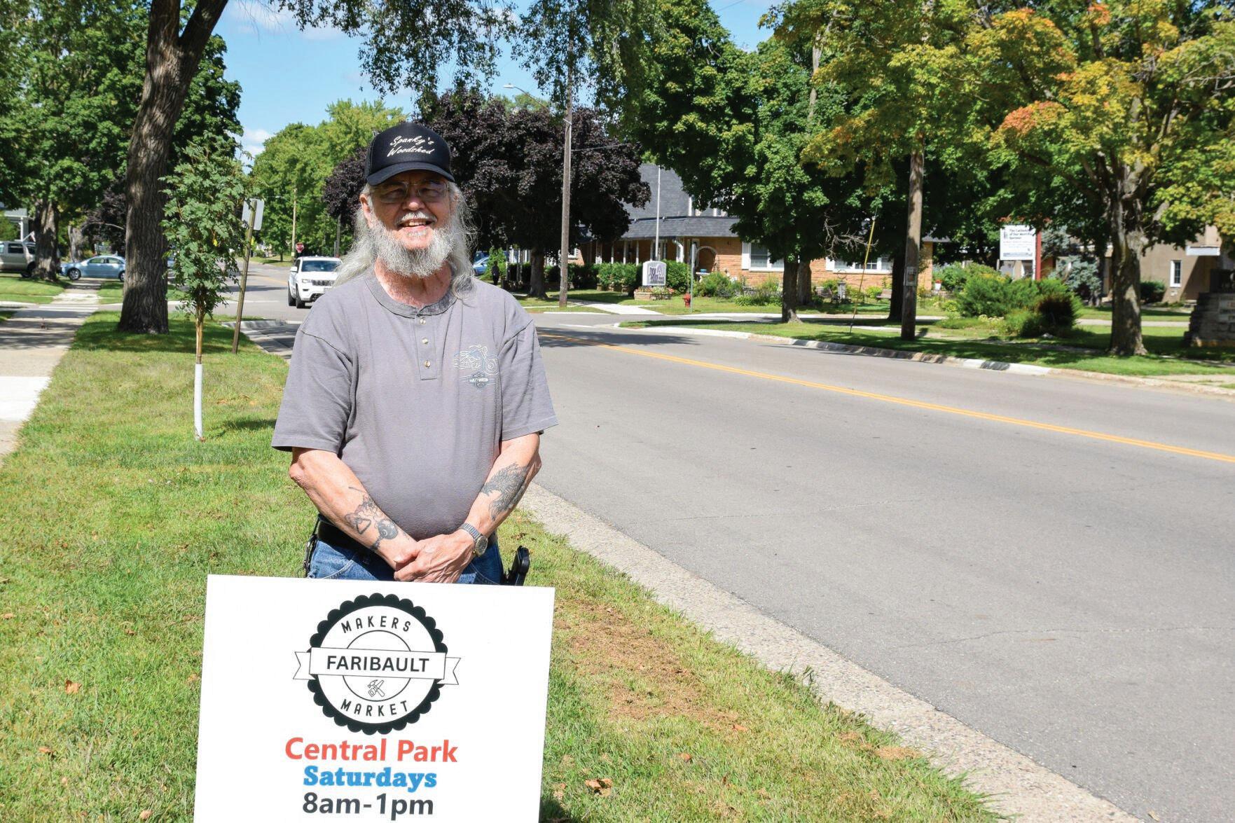 John “Spanky” St. Clair standing in front of his Makers Market sign. He helped create it for makers in town who wanted to showcase their work for people to buy. (Lauren Viska - Faribault.com)