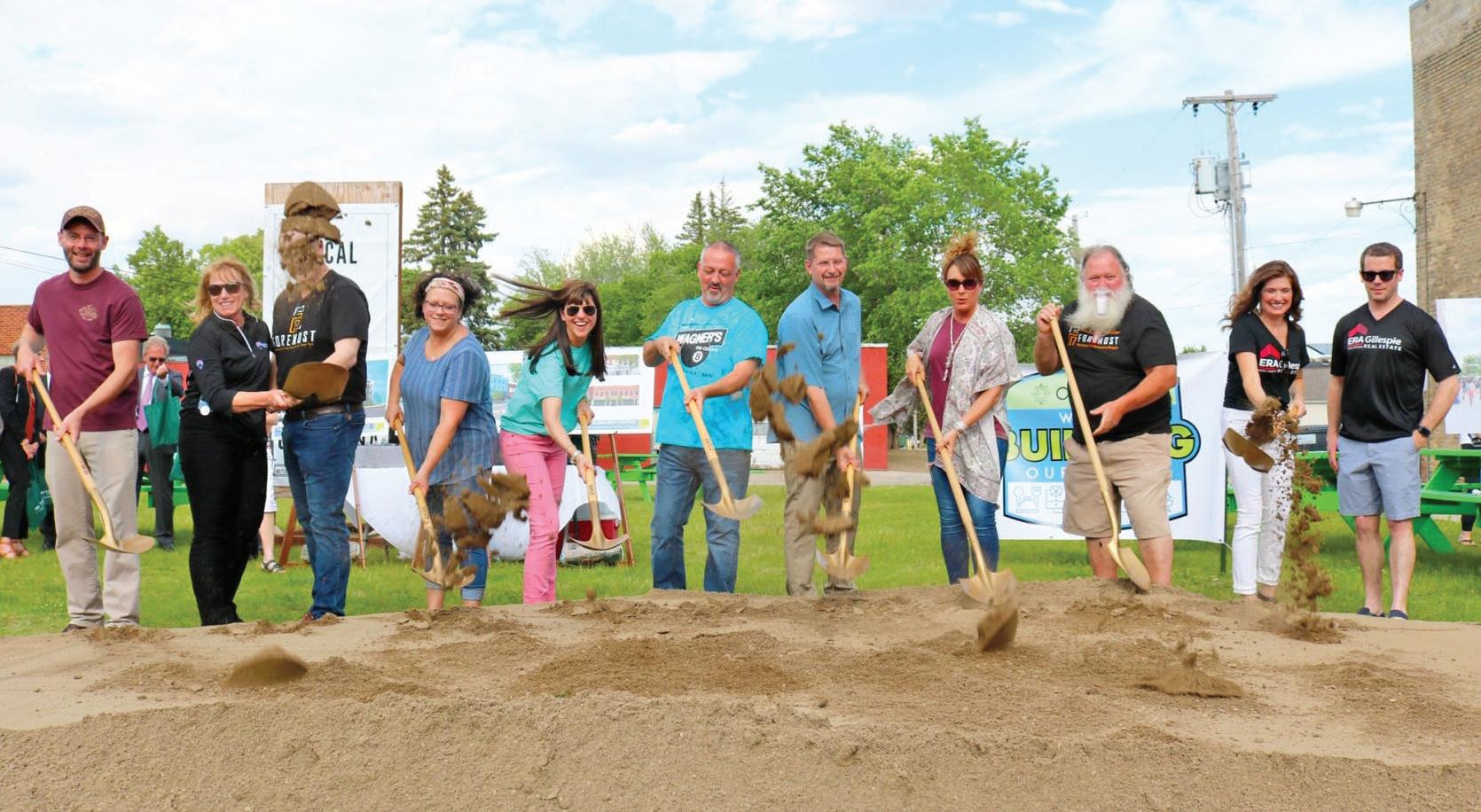 LEFT: Downtown business owners, including Deb and Matt Gillard of RE/MAX Venture (second and third from the left), throw dirt in solidarity at the groundbreaking ceremony for three major downtown Owatonna projects that began in June. (File photo - Owatonna.com) RIGHT: RE/MAX Venture owners Matt and Deb Gillard have participated in the downtown spring cleaning event since 2016, providing lunch for ALC students after the service day. (File photo - Owatonna.com)