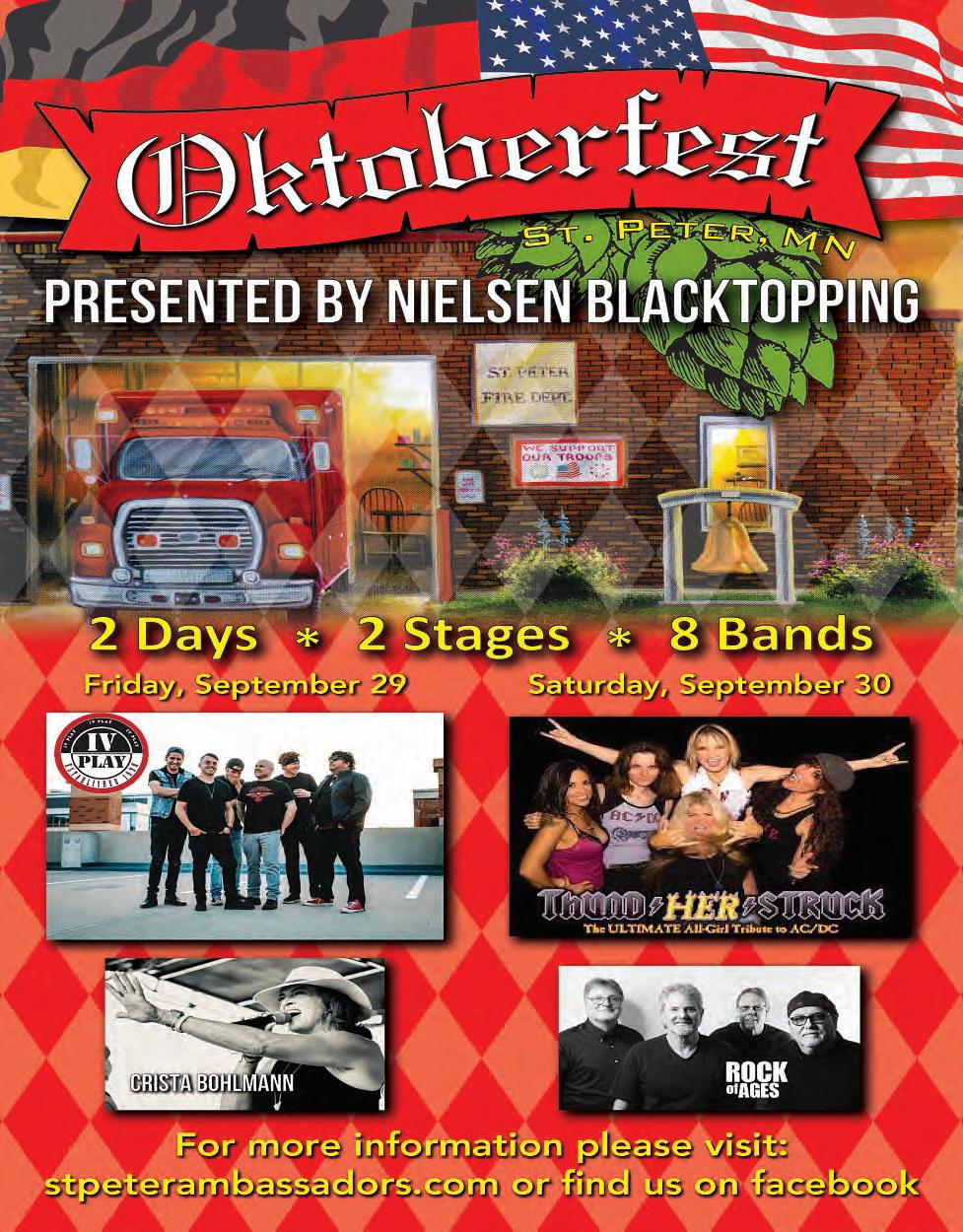 A two-day experience, the 2023 St. Peter Oktoberfest will be held at the Nicollet County Fairgrounds in St. Peter. The action begins at 4 p.m. on Sept. 29 and will conclude on Sept. 30. The event will include two stages, eight bands, great Oktoberfest beer and food, artisan vendors and plenty of fall fun. Highlights include performances on Friday night by Crista Bohlmann and IV Play and on Saturday night by Rock of Ages and Thund-Her-Struck. The celebration is put on by the St. Peter Ambassadors and sponsored this year by Nielsen Blacktopping.