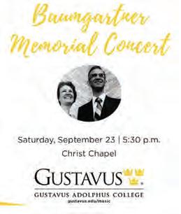 Baumgartner Memorial Concert - St. Peter-5:30 p.m., Gustavus Adolphus College, 800 West College Ave, St. Peter. The Gustavus Music Department is proud to present the Baumgartner Memorial Concert. The concert will also be streamed live in YouTube.