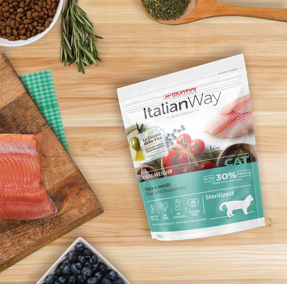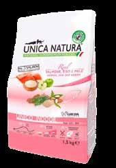 Ricetta con un’unica fonte proteica animale: pesce pelagico, proveniente da itticolture sostenibili.