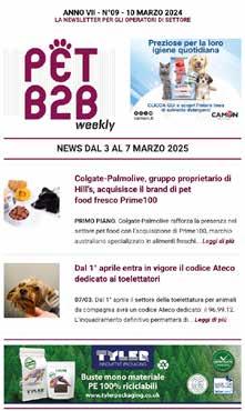 Pet B2B: periodico mensile Anno 10 - n.4 - Aprile 2025 Registrazione al Tribunale di Milano n. 92 del 1o marzo 2016. Una copia 1,00 euro. Poste Italiane SpA - Spediz. in Abb. Postale D.L. 353/2003 (Conv. in Legge 27/02/2004 n°46) Art.1 Comma 1 D.C.B. Milano - L’editore garantisce la massima riservatezza dei dati personali in suo possesso. Tali dati saranno utilizzati per la gestione degli abbonamenti e per l’invio di informazioni commerciali. In base all’Art. 13 della Legge numero 196/2003, i dati potranno essere rettificati o cancellati in qualsiasi momento scrivendo a: Editoriale Farlastrada Srl